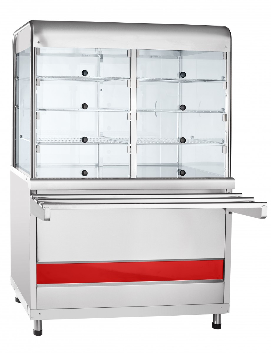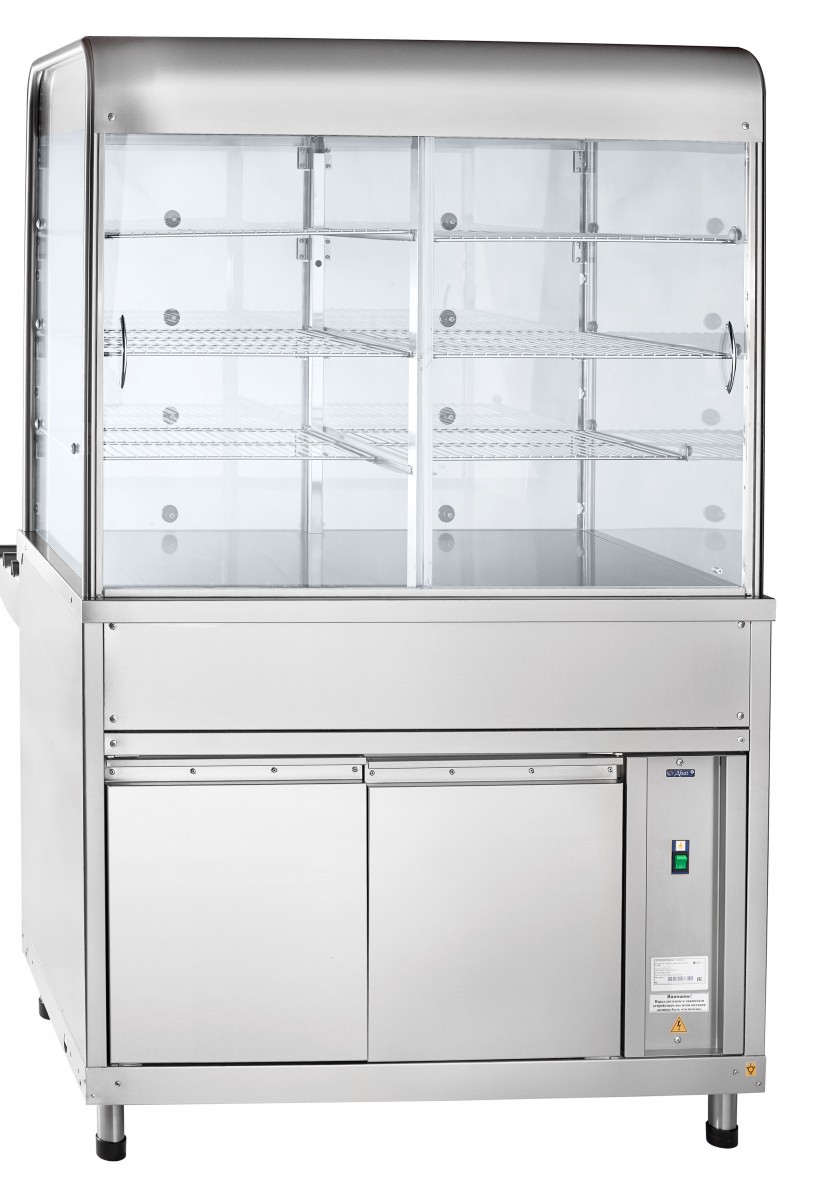 Витрина имеет три ряда полок-решеток. Две лампы подсветки. Внизу нейтральный шкаф с полкой для хранения инвентаря и продуктов. Регулируемые по высоте ножки. Направляющие входят в комплект поставки.