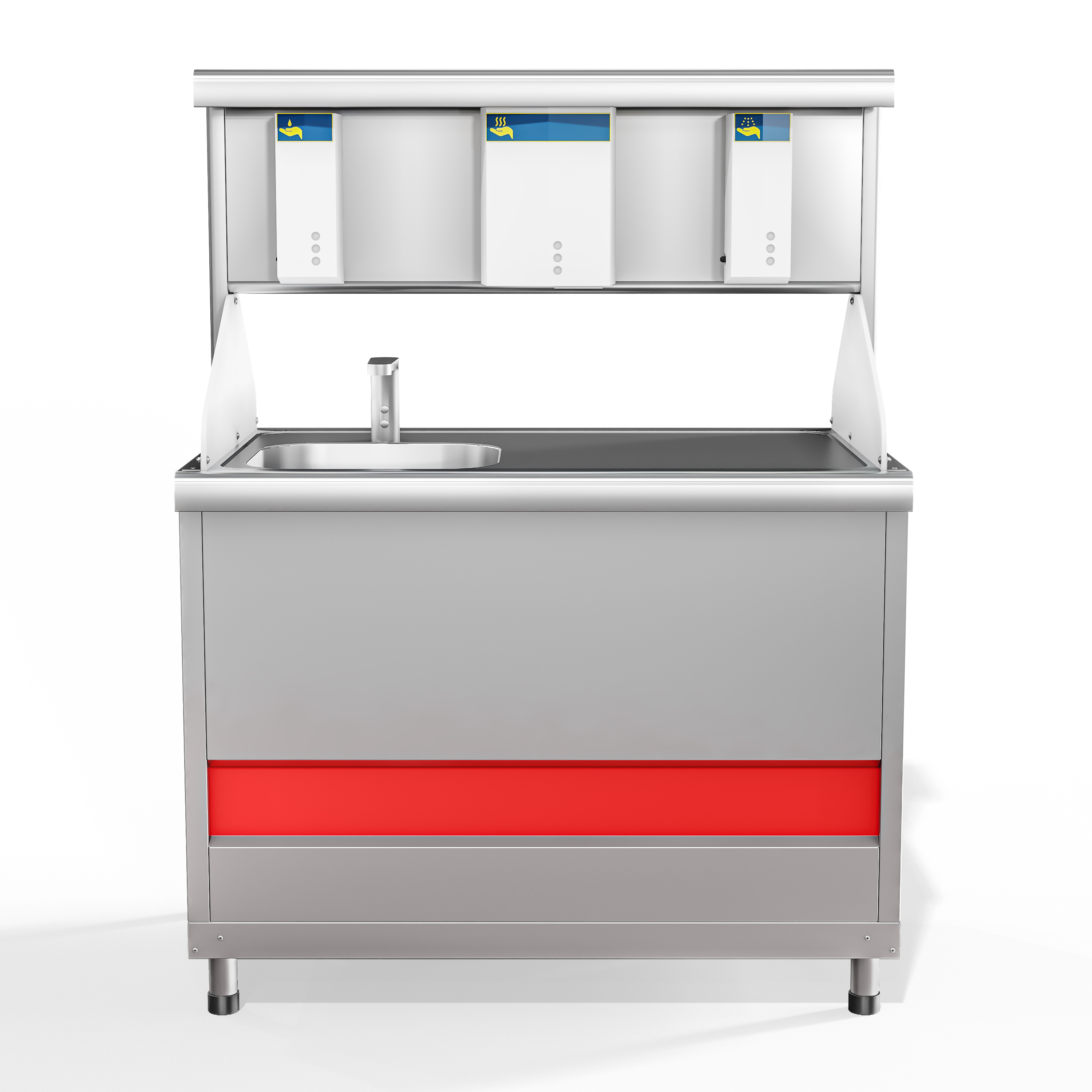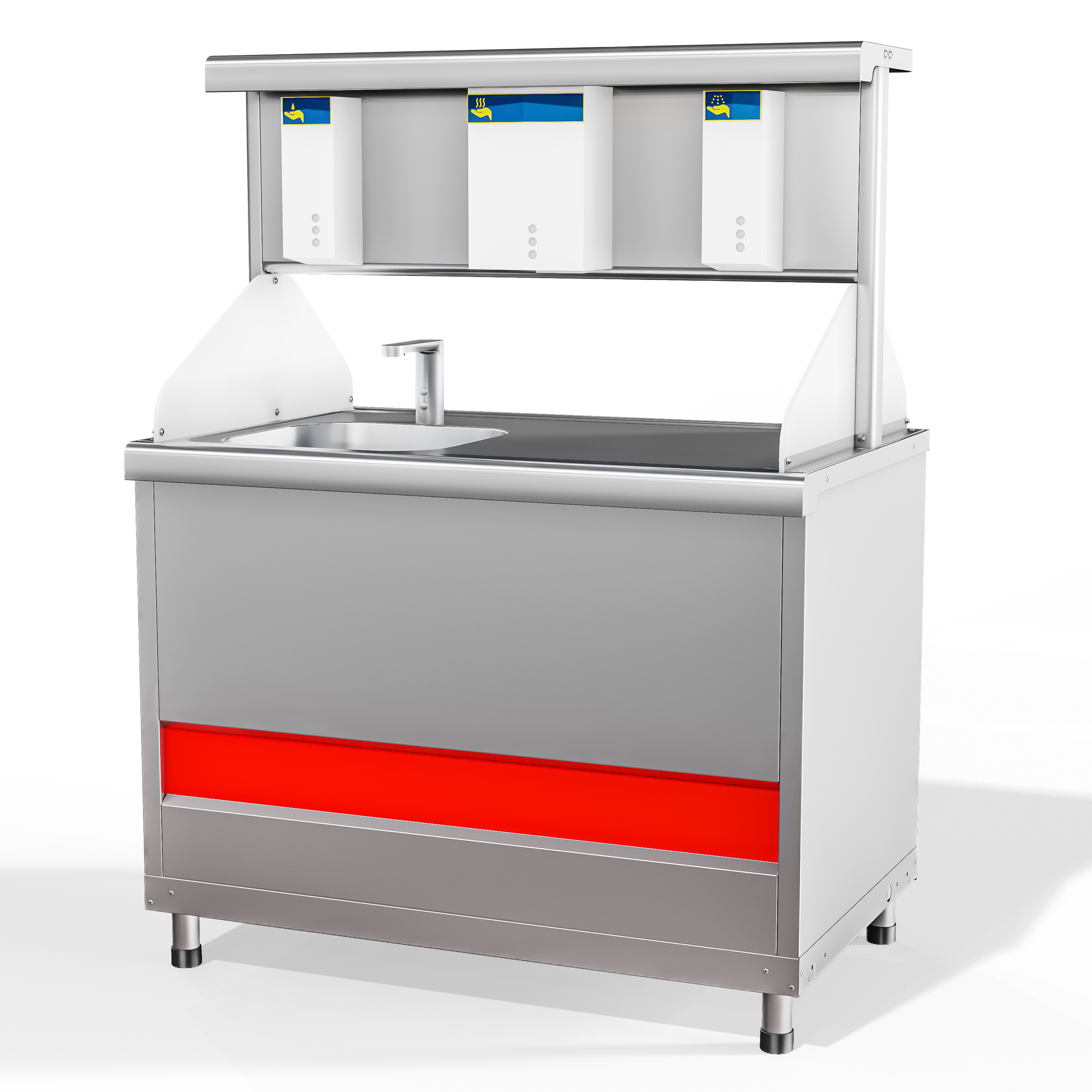 Прилавок обеспечивает автоматическую бесконтактную дозацию жидкого мыла на руки клиентов, мытьё рук, сушку рук и автоматическую бесконтактную дозацию антисептического раствора на руки пользователя.