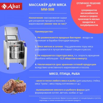 Процесс массирования и маринования происходит во вращающемся на небольшой скорости барабане (12,5 оборотов в минуту), что позволяет приправам и специям проникнуть в волокна мяса, не нарушая структуру продукции. К примеру, с массажером ММ-50В Вам не придется ждать всю ночь для маринования шашлыка: Вы просто выбираете время приготовления на панели управления, загружаете куски мяса в барабан и добавляете необходимые ингредиенты. По окончании работы изделия от Вас потребуется только извлечь мясо из барабана. Благодаря вакуумному массажеру для мяса ММ-50В траты времени на естественный процесс маринования снижаются с нескольких часов до часа по сравнению с посолом вручную!