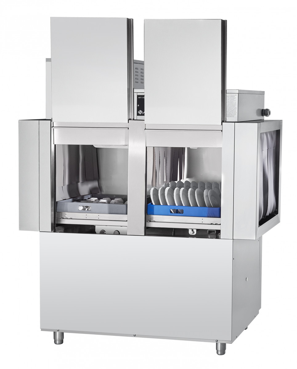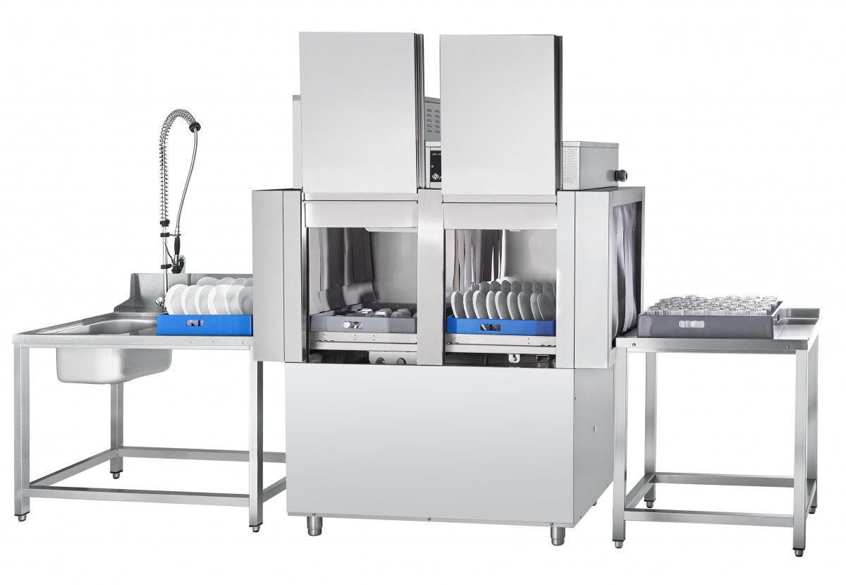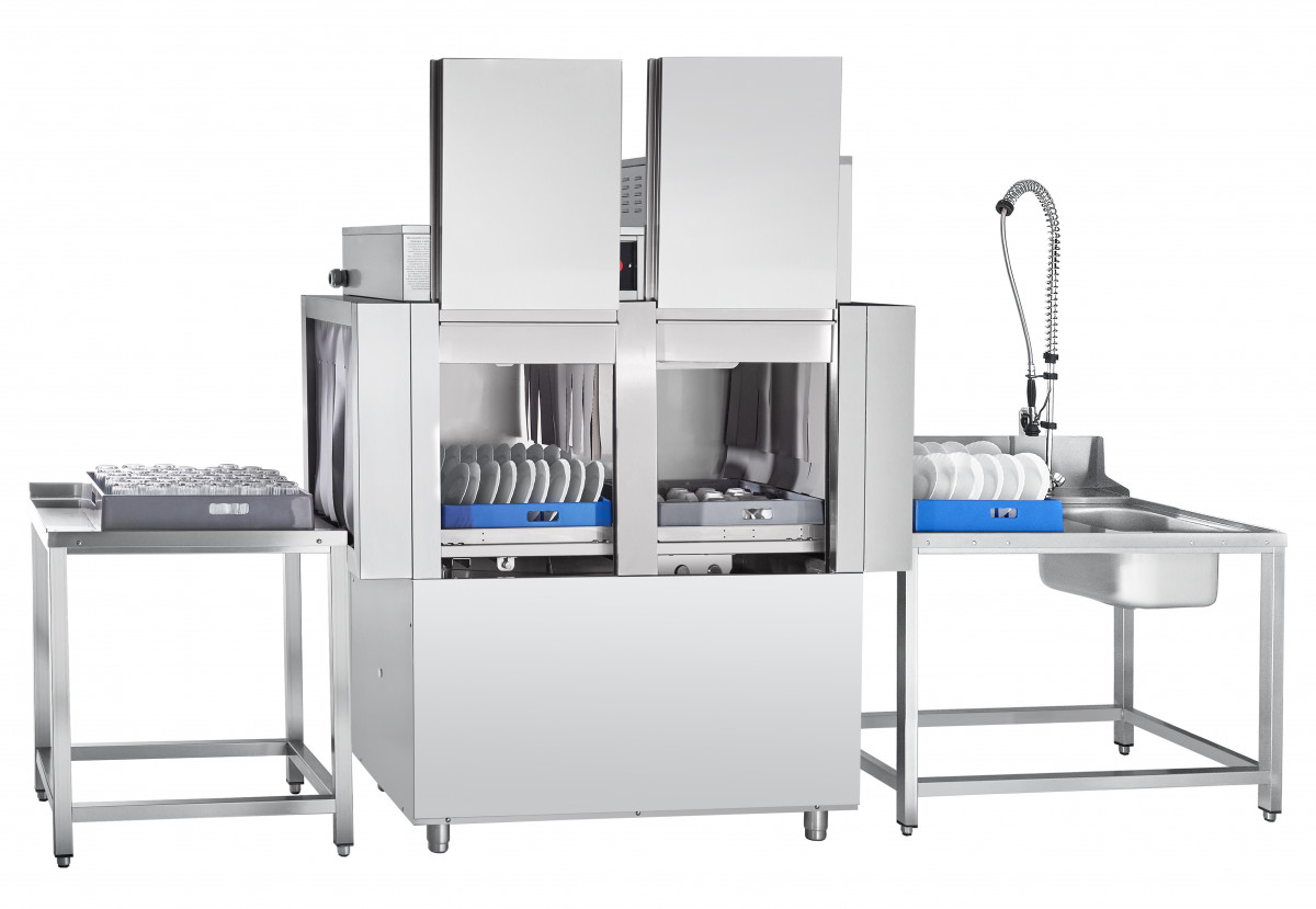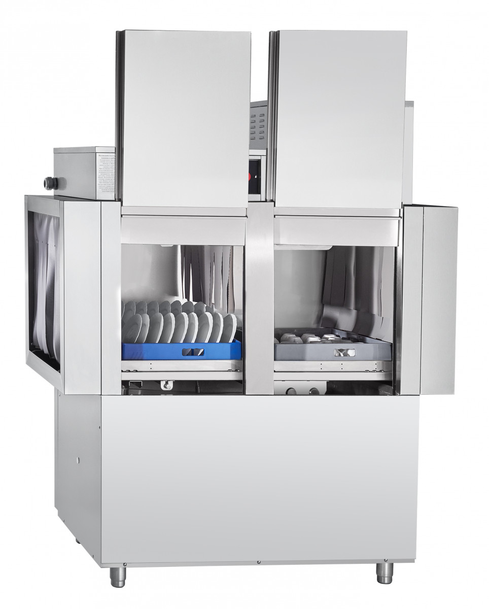 Туннельная посудомоечная машина МПТ-1700-01 с теплообменником предназначена для мытья тарелок, стаканов, чашек, столовых приборов на малых и средних предприятиях общественного питания. Выпускается в правом (движение посуды справа налево) и левом (движении посуды слева направо) исполнении. Производительность кассет/тарелок в час - 95/1710 шт. Машина имеет раздельные системы циркуляции воды для мытья и ополаскивания. Корпус двухстенный с теплоизолирующим зазором 15 мм. Может эксплуатироваться как при горячем водоснабжении, так и при холодном водоснабжении. Скругленные углы ванны облегчают гигиеническую уборку машины. Разборная конструкция разбрызгивателей позволяет производить их чистку. Металлические детали машин, контактирующие с водой, а также облицовка, изготовлены из нержавеющей стали марки AISI 304. Моющие и ополаскивающие разбрызгиватели изготовлены из нержавеющей стали марок AISI 304 и AISI 321. Управление работой машины осуществляется с кнопочной электронной панели. Обеспечивается автоматическое наполнение ванны водой и поддержание её уровня. Емкость ванны - 100 литров. Осуществляется постоянный контроль температуры и уровня воды в ванне и бойлере. Двойная система фильтров в моечной ванне. Система рекуперации энергии использует имеющееся тепло машины для предварительного нагрева подаваемой холодной воды, что существенно экономит электроэнергию. Принцип работы теплообменника (рекуператора) МПТ-1700-01: рекуператор забирает тепло пара, создаваемого во время ополаскивания в камере тунельной машины, и передает его воде, которая поступает в бойлер, что обеспечивает непрерывную работу посудомоечной машины не только при горячем, но и при холодном водоснабжении. Это позволяет экономить электроэнергию и использовать меньшую мощность ТЭН-ов бойлера. Таким образом, использование теплообменника окупится за 3-4 месяца. Машина стандартно комплектуется: - 4-мя кассетами для мытья тарелок; - 2-мя кассетами для стаканов и чашек; - кассетой для столовых приборов; - металлической сеткой (рамкой в сборе) для мытья легких предметов и приборов; - дозатором моющего средства; - дозатором ополаскивающего средства. Характеристики: Номинальная потребляемая мощность, кВт, не более 26,7 Номинальное напряжение, В 400 Температура мойки, °С, не менее +55 Температура ополаскивания, °С, не менее +85 Температура водопроводной сети, °С, не менее +5 Количество программ мойки 3 Производительность кассет/тарелок в час 95/1710 Подача моющего средства автоматическая Подача ополаскивающего средства автоматическая Габаритные размеры, мм 1595х770х1965 Масса, кг 260