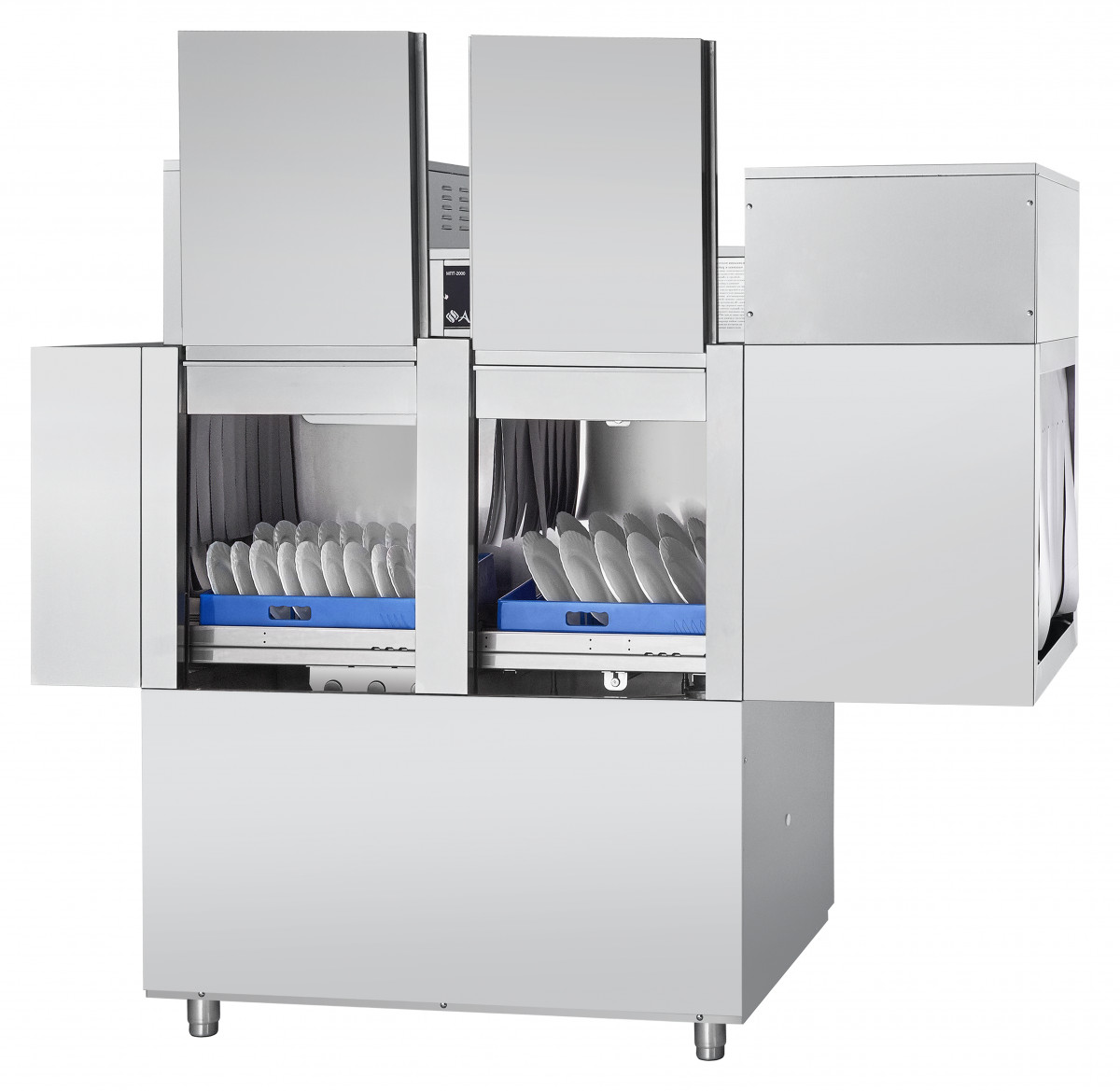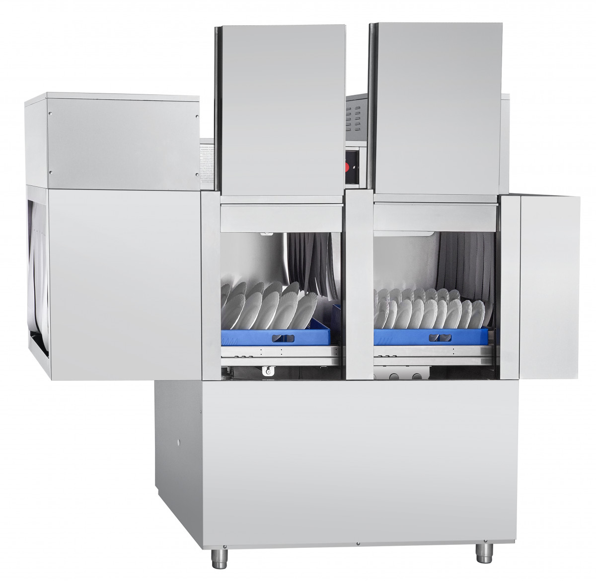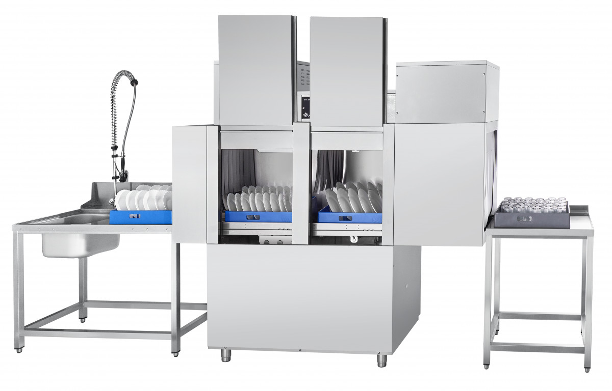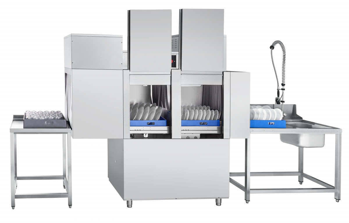 Туннельная посудомоечная машина МПТ-2000 предназначена для мытья тарелок, стаканов, чашек, столовых приборов на малых и средних предприятиях общественного питания. Выпускается в правом (движение посуды справа налево) и левом (движении посуды слева направо) исполнении. Производительность кассет/тарелок в час - 111/1998 шт. Машина имеет раздельные системы циркуляции воды для мытья и ополаскивания. Корпус двухстенный с теплоизолирующим зазором 15 мм. Может эксплуатироваться как при горячем водоснабжении, так и при холодном водоснабжении. Система рекуперации энергии использует имеющееся тепло машины для предварительного нагрева подаваемой холодной воды, что существенно экономит электроэнергию. Принцип работы теплообменника (рекуператора) МПТ-2000: рекуператор забирает тепло пара, создаваемого во время ополаскивания в камере тунельной машины, и передает его воде, которая поступает в бойлер, что обеспечивает непрерывную работу посудомоечной машины не только при горячем, но и при холодном водоснабжении. Это позволяет экономить электроэнергию и использовать меньшую мощность ТЭН-ов бойлера. Таким образом, использование теплообменника окупится за 3-4 месяца. Система сушки обеспечивает нагрев выходящей посуды, что сокращает время ее окончательного высыхания. Скругленные углы ванны облегчают гигиеническую уборку машины. Разборная конструкция разбрызгивателей позволяет производить их чистку. Металлические детали машин, контактирующие с водой, а также облицовка, изготовлены из нержавеющей стали марки AISI 304. Моющие и ополаскивающие разбрызгиватели изготовлены из нержавеющей стали марок AISI 304 и AISI 321. Управление работой машины осуществляется с кнопочной электронной панели. Обеспечивается автоматическое наполнение ванны водой и поддержание её уровня. Емкость ванны - 100 литров. Осуществляется постоянный контроль температуры и уровня воды в ванне и бойлере. Двойная система фильтров в моечной ванне. Машина стандартно комплектуется: - 4-мя кассетами для мытья тарелок; - 2-мя кассетами для стаканов и чашек; - кассетой для столовых приборов; - металлической сеткой (рамкой в сборе) для мытья легких предметов и приборов; - дозатором ополаскивающего средства; - дозатором моющего средства. Характеристики: Номинальная потребляемая мощность, кВт, не более 34,4 Номинальное напряжение, В 400 Температура мойки, °С, не менее +55 Температура ополаскивания, °С, не менее +85 Температура водопроводной сети, °С, не менее +5 Количество программ мойки 3 Производительность 111/1998 кассет/тарелок в час 3 программы мойки (скорости конвейера) Продолжительность цикла мойки и ополаскивания (для одной кассеты на 3 скорости) 82 с Подача моющего средства автоматическая Подача ополаскивающего средства автоматическая Габаритные размеры, мм 2145x770x1965 Масса, кг 310