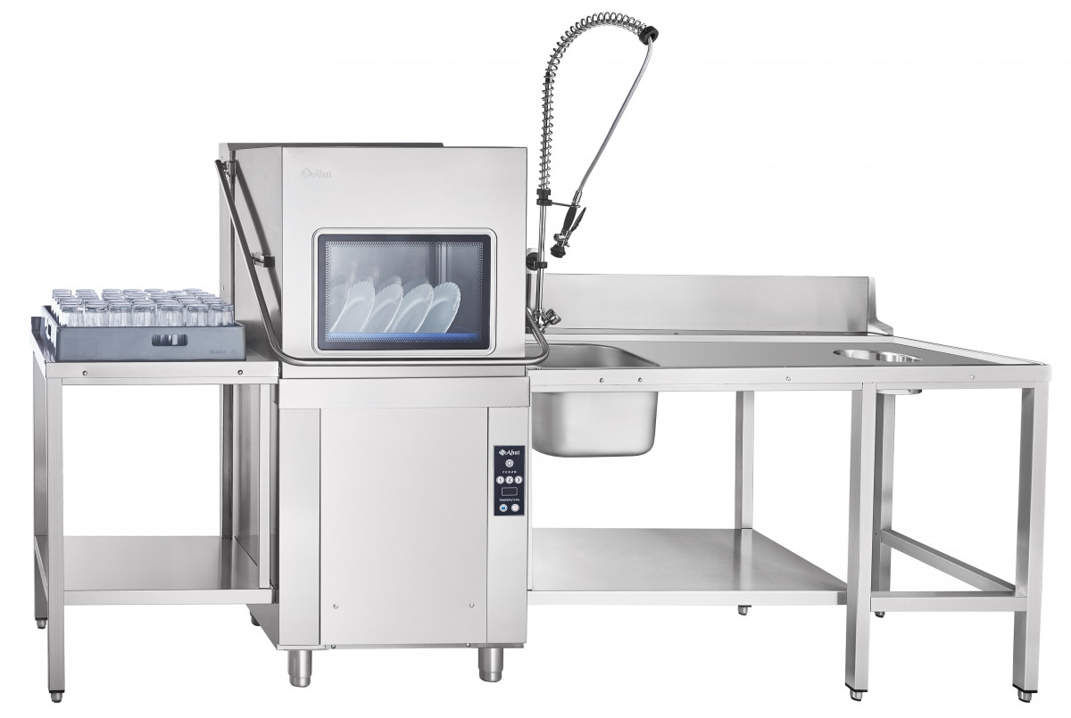 Для мытья тарелок, стаканов, столовых приборов и подносов на предприятиях общественного питания с числом посадочных мест 50, а также с большим числом мест, при условии, что количество обрабатываемой посуды не превышает производительности машины. Конструкция машины позволяет использовать ее как при горячем, так и при холодном водоснабжении.