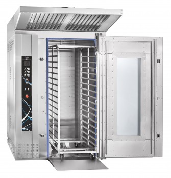 - совершенная аэродинамика обеспечивает равномерную температуру по всей рабочей камере и совместно с вращением тележки позволяет достичь равномерной окраски выпечки на всех уровнях тележки-шпильки;